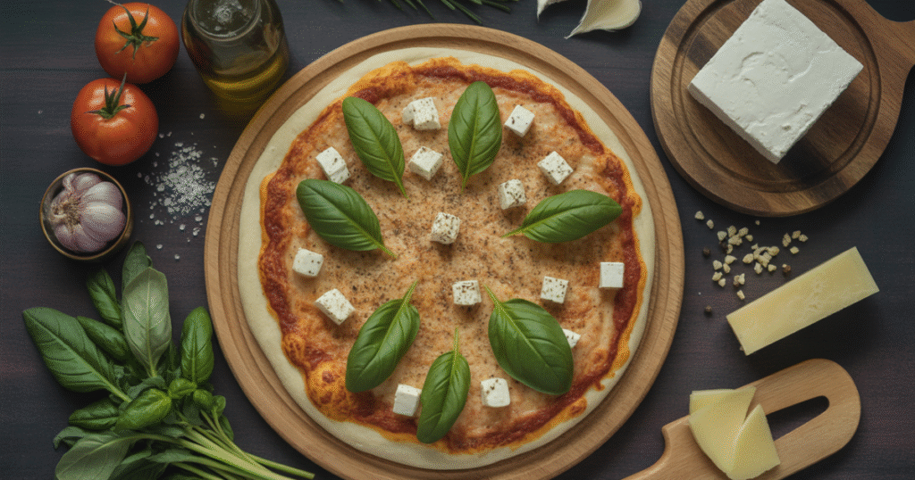 A traditional oven-baked pizza with feta, mozzarella, garlic, spinach, and a touch of olive oil. The addition of onions, mushrooms, or black olives can enhance the taste of various foods.