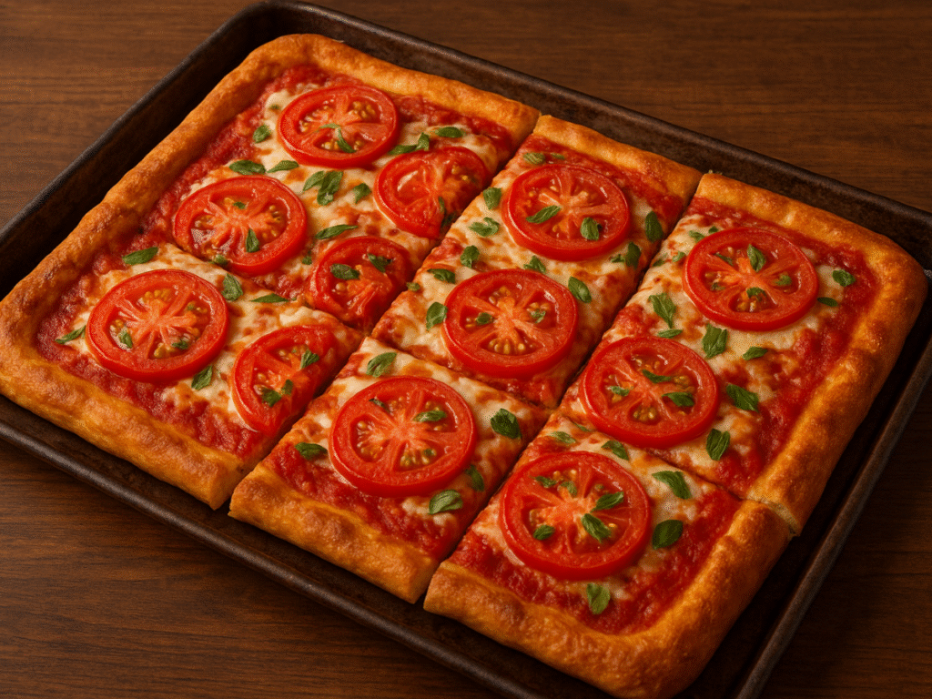 Tomato Pie Pizza is a classic style of pizza featuring a thick crust and a generous layer of tangy tomato sauce, often with little or no cheese. Unlike ordinary pizza, it carries a rustic charm with its bold yet straightforward ingredients. Depending on where you taste it, this dish may resemble a fresh tomato pie, a savoury tomato tart, or even an Italian tomato pie layered on chewy dough.